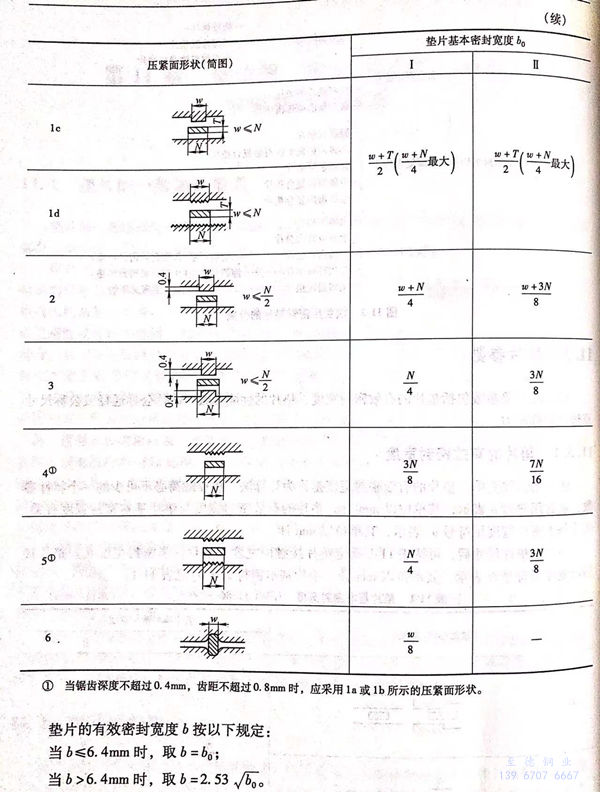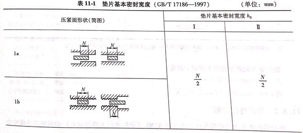 當選定墊片尺寸后,可按表11-1確定墊片接觸面寬度和墊片基本密封寬度b0。墊片接觸面寬度以符號N表示,其單位以mm計。墊片基本密封寬度b0見表11-1。
