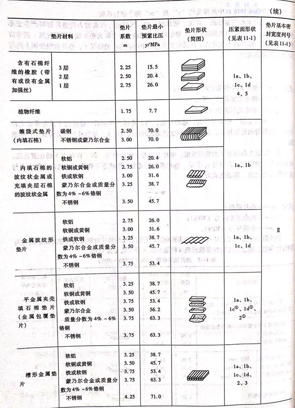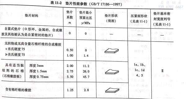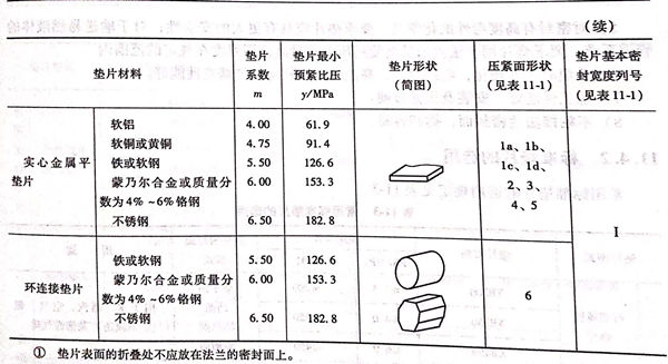 不銹鋼法(fa)蘭墊(dian)(dian)片(pian)最小預緊比壓和墊(dian)(dian)片(pian)系數由實驗(yan)確(que)定,它們是僅(jin)與墊(dian)(dian)片(pian)材料(liao)及法(fa)蘭密封面形式有關的特性參數。規范墊(dian)(dian)片(pian)特性參數或墊(dian)(dian)片(pian)性能參數m及y值見表11-2。
