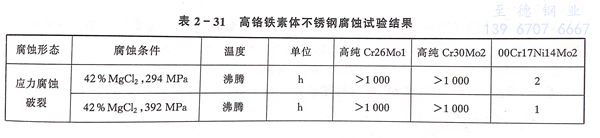 高純Cr26Mo1、S44629 不銹鋼有著優異的耐應力腐蝕破裂性能,特別在氯化物和含氧化劑的NaOH溶液中更為突出,例如表2-31所示,高純Cr26Mo1不銹鋼在42%MgCl2沸騰溶液中屈服應力為392MPa試驗1000小時也不會發生破裂。但是高純Cr26Mo1耐應力腐蝕破裂也是有條件的,例如在敏化態和中溫時效態,遭受不適宜冷加工以及承受過大的載荷應力時,也顯著降低鋼的耐應力腐蝕性能,從而產生應力腐蝕破裂。