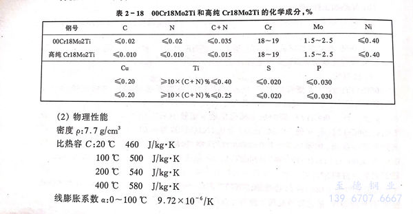 00Cr18Mo2Ti和高純Cr18Mo2Ti 不(bu)銹鋼的化學成分(fen)見表2-18。