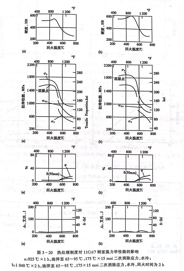 7Cr17、68Cr17、440A不銹(xiu)鋼(gang)、8Cr17、85Cr17、440B不銹(xiu)鋼(gang)、11Cr17、108Cr17、440C不銹(xiu)鋼(gang)的高溫(wen)力學性能見圖3-21。在(zai)482℃回火(huo),保溫(wen)時間和軟化效(xiao)果見圖3-22。