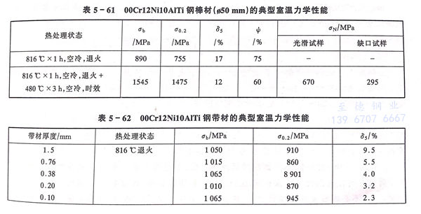 00Cr12Ni10AlTi 不(bu)銹鋼(gang)在退火(huo)條(tiao)件下(xia)具有較(jiao)高的(de)抗拉強(qiang)(qiang)度和屈服強(qiang)(qiang)度,且塑(su)性(xing)(xing)和韌性(xing)(xing)良好。通過(guo)簡單的(de)時(shi)(shi)效處理,其強(qiang)(qiang)度水平較(jiao)退火(huo)狀態提高1倍,同(tong)時(shi)(shi)保(bao)留了足夠的(de)塑(su)韌性(xing)(xing)。00Cr12Ni10AITi 不(bu)銹鋼(gang)棒材、帶材及時(shi)(shi)效處理對室溫力學(xue)性(xing)(xing)能的(de)影響(xiang)見表5-61至(zhi)表5-63。