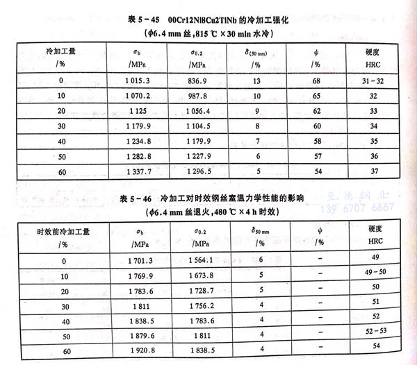 盡管(guan)此鋼在退火狀態下是馬(ma)氏體組織(zhi),但鋼的(de)硬(ying)度僅(jin)為(wei)30~35HRC,易于進行(xing)(xing)冷(leng)(leng)(leng)加(jia)(jia)工,鋼的(de)冷(leng)(leng)(leng)加(jia)(jia)工硬(ying)化(hua)傾向很低(見(jian)表5-45),不需中(zhong)間退火即可進行(xing)(xing)較大變形(xing)量的(de)冷(leng)(leng)(leng)加(jia)(jia)工,最終熱處(chu)理(li)前(qian)進行(xing)(xing)冷(leng)(leng)(leng)變形(xing),可獲得較高的(de)拉(la)伸強度和屈(qu)服強度。