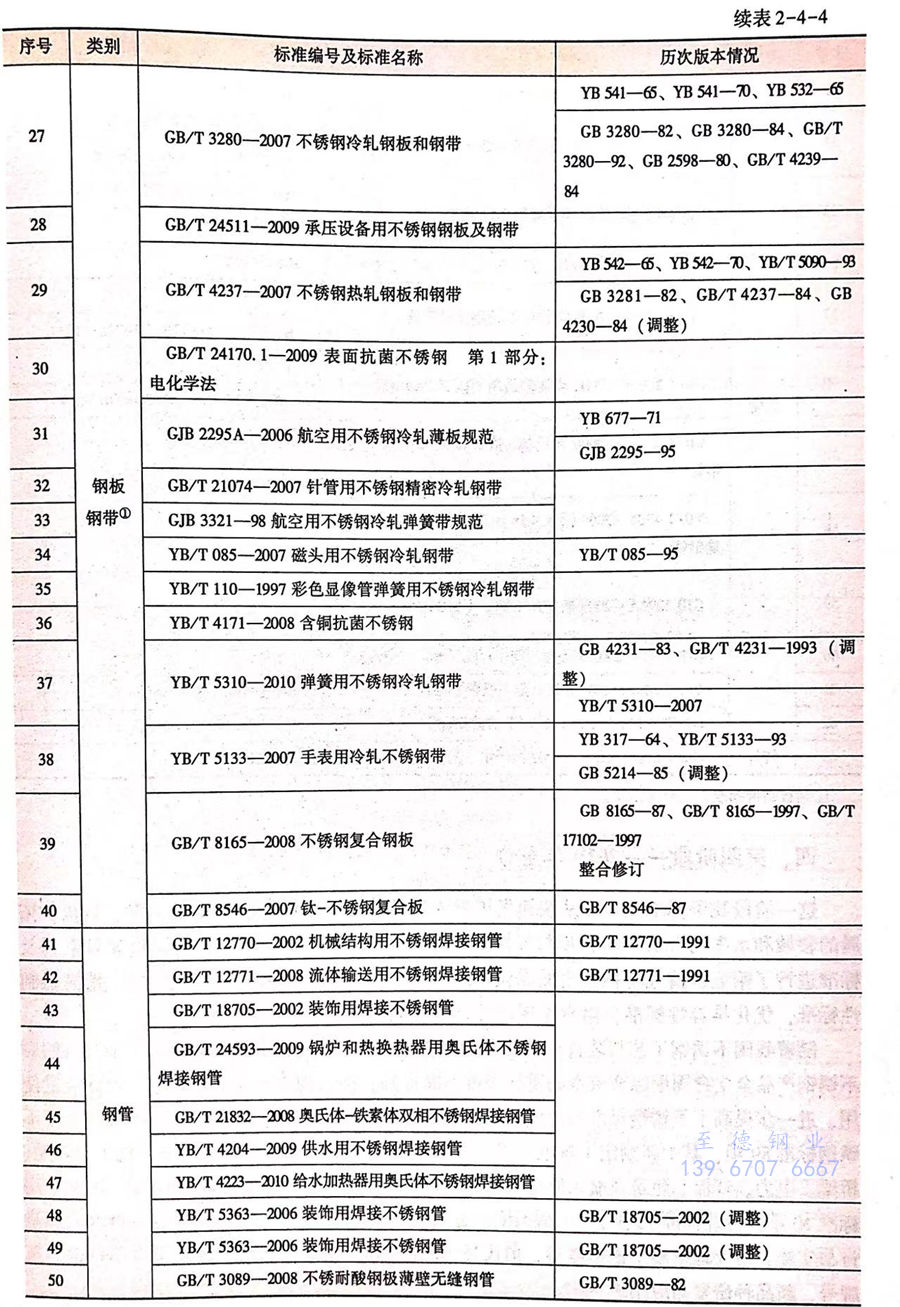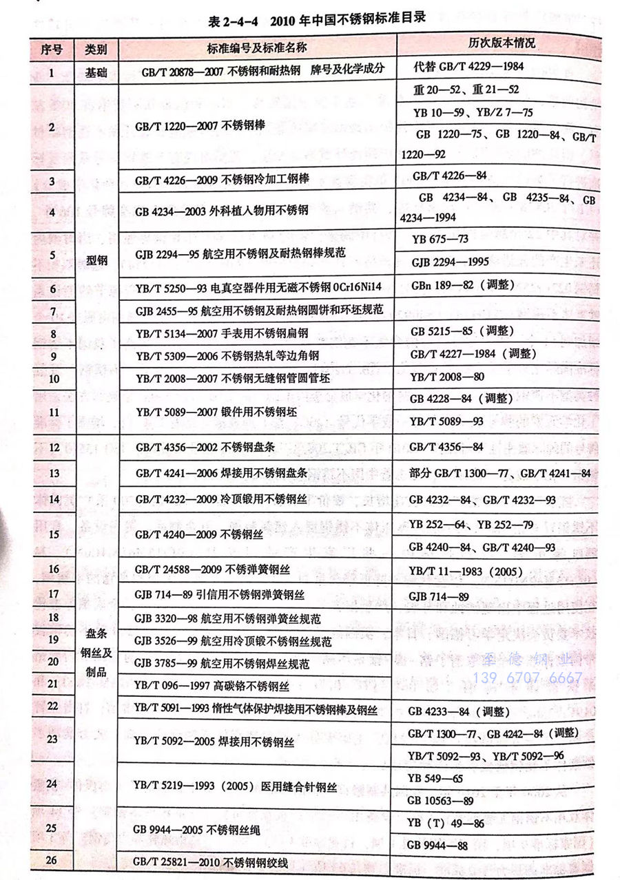 從2000年至2010年,我國共制修訂不銹鋼標準46項,其中新制定了《奧氏體-鐵素體雙相不(bu)銹鋼(gang)無縫鋼(gang)管》《承壓設備用不銹鋼鋼板及鋼帶》《含銅抗菌不銹鋼》等14項(國家標準9項,國家軍用標準1項,行業標準4項),將《不銹鋼熱軋等邊角鋼》等3項國家標準調整為行業標準,標準總數共63項(見表2-4-4)。