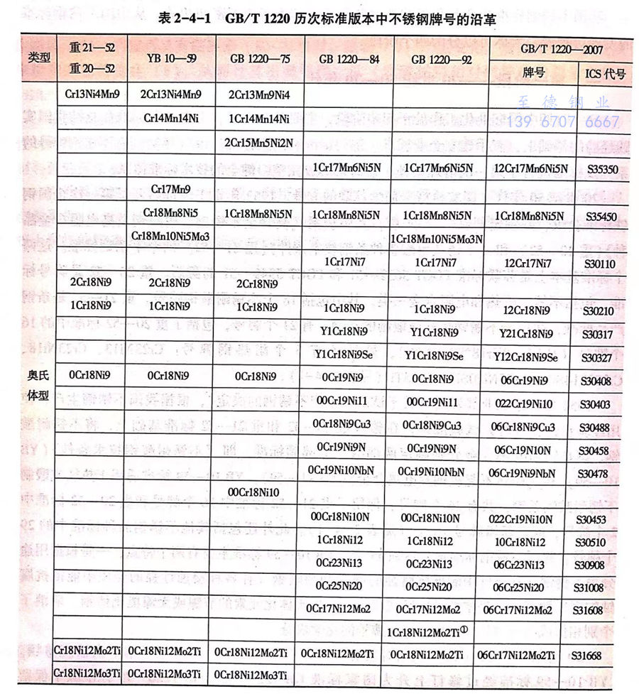 1954年,重(zhong)工(gong)業部發出“關于試制和(he)生產(chan)不(bu)(bu)銹(xiu)鋼(gang)(gang)(gang)(gang)(gang)(gang)的(de)決定(ding)”,根據我(wo)國不(bu)(bu)銹(xiu)鋼(gang)(gang)(gang)(gang)(gang)(gang)生產(chan)、使用經驗(yan)和(he)新牌(pai)(pai)(pai)號(hao)研究試驗(yan)成果,在(zai)(zai)整(zheng)合重(zhong)20-52和(he)重(zhong)21-52標(biao)準(zhun)基礎上,將不(bu)(bu)銹(xiu)耐(nai)酸(suan)鋼(gang)(gang)(gang)(gang)(gang)(gang)、耐(nai)熱鋼(gang)(gang)(gang)(gang)(gang)(gang)和(he)電熱合金分(fen)別(bie)制定(ding)兩部冶金部部頒標(biao)準(zhun),即《不(bu)(bu)銹(xiu)耐(nai)酸(suan)鋼(gang)(gang)(gang)(gang)(gang)(gang)技術條(tiao)件》(YB10-59)和(he)《耐(nai)熱不(bu)(bu)起(qi)皮鋼(gang)(gang)(gang)(gang)(gang)(gang)及電熱合金》(YB11-59)。YB 10-59標(biao)準(zhun)適用于熱軋或(huo)鍛(duan)制不(bu)(bu)銹(xiu)耐(nai)酸(suan)鋼(gang)(gang)(gang)(gang)(gang)(gang)條(tiao)鋼(gang)(gang)(gang)(gang)(gang)(gang),共(gong)有36個(ge)(ge)(ge)(ge)牌(pai)(pai)(pai)號(hao),保留了重(zhong)21-52標(biao)準(zhun)中16個(ge)(ge)(ge)(ge)牌(pai)(pai)(pai)號(hao)和(he)重(zhong)20-52標(biao)準(zhun)中2個(ge)(ge)(ge)(ge)牌(pai)(pai)(pai)號(hao),同時新增(zeng)牌(pai)(pai)(pai)號(hao)18個(ge)(ge)(ge)(ge)(見(jian)表(biao)2-4-1)。此(ci)外(wai)還包括(kuo)其他不(bu)(bu)銹(xiu)鋼(gang)(gang)(gang)(gang)(gang)(gang)品種標(biao)準(zhun)中的(de)29個(ge)(ge)(ge)(ge)牌(pai)(pai)(pai)號(hao),我(wo)國不(bu)(bu)銹(xiu)鋼(gang)(gang)(gang)(gang)(gang)(gang)標(biao)準(zhun)牌(pai)(pai)(pai)號(hao)達(da)到65個(ge)(ge)(ge)(ge)。YB 10-59標(biao)準(zhun)主要有兩個(ge)(ge)(ge)(ge)特點:一是根據用途分(fen)為不(bu)(bu)銹(xiu)鋼(gang)(gang)(gang)(gang)(gang)(gang)(在(zai)(zai)空氣中能抵(di)抗(kang)腐蝕(shi)(shi)的(de)鋼(gang)(gang)(gang)(gang)(gang)(gang))和(he)耐(nai)酸(suan)鋼(gang)(gang)(gang)(gang)(gang)(gang)(在(zai)(zai)各種浸蝕(shi)(shi)性強的(de)介質中能抵(di)抗(kang)腐蝕(shi)(shi)的(de)鋼(gang)(gang)(gang)(gang)(gang)(gang))兩組(zu);二是增(zeng)加(jia)了以(yi)錳或(huo)錳、氮作(zuo)奧氏體化(hua)元素的(de)節鎳(nie)或(huo)無鎳(nie)奧氏體鋼(gang)(gang)(gang)(gang)(gang)(gang),取消了個(ge)(ge)(ge)(ge)別(bie)相似或(huo)相近(jin)牌(pai)(pai)(pai)號(hao),調整(zheng)了部分(fen)牌(pai)(pai)(pai)號(hao)的(de)化(hua)學成分(fen)。