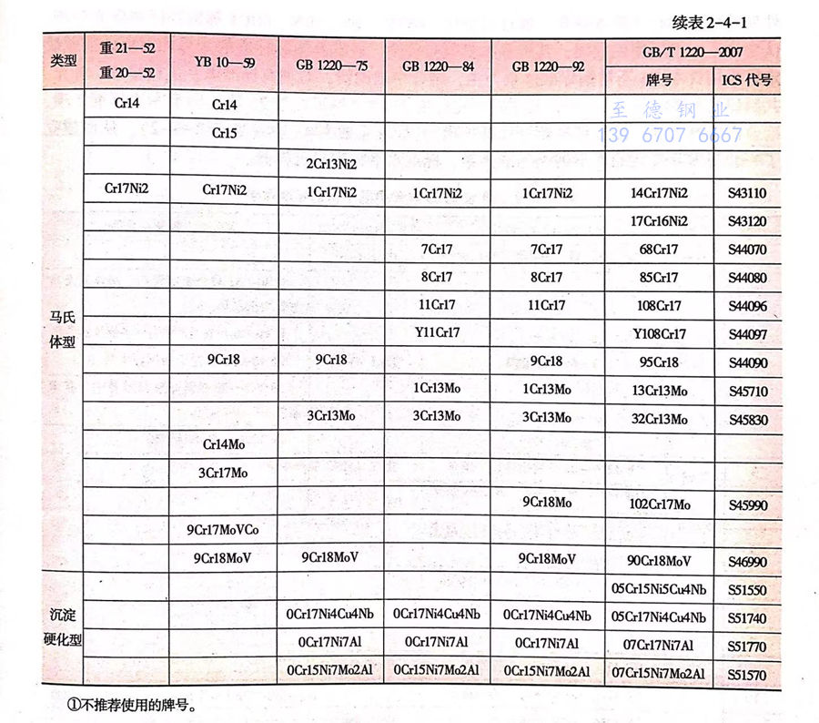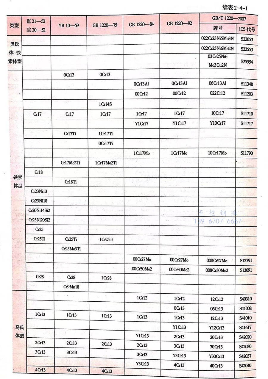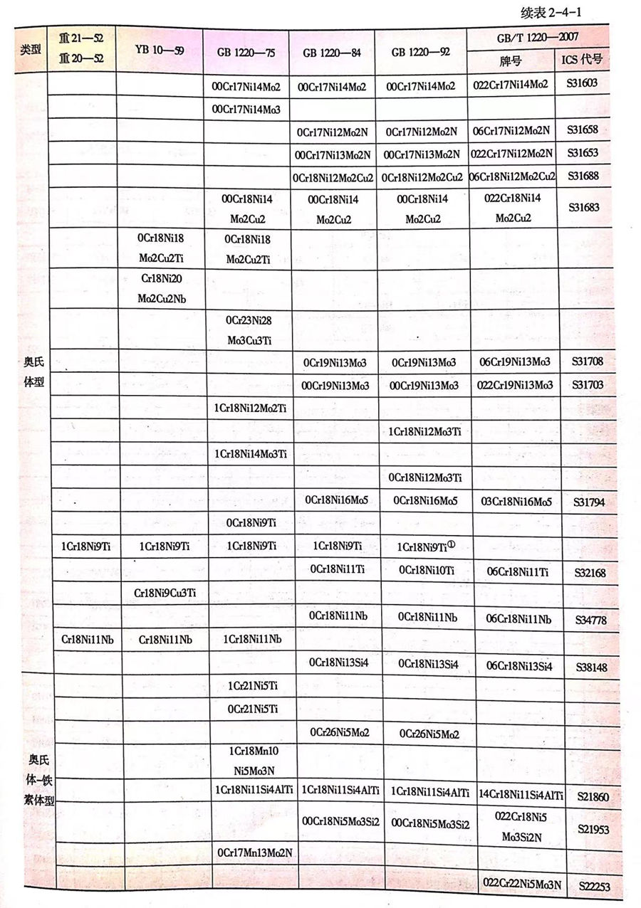 20世紀60-70年代,我國對現有不銹鋼牌號系列及標準進行了第一次清理整頓。YB10-59標準經過修訂上升為國家標準GB 1220-75。GB 1220-75標準除了保留 YB 10-59標準中26個牌號和其他品種標準中的12個牌號外,首次納入了超低碳奧氏體不銹鋼(00Cr18Ni10、00Cr17Ni14Mo3、00Cr18Ni14Mo2Cu2)、奧氏體-鐵素體型不銹鋼(1Cr21Ni5Ti、0Cr21Ni5Ti、1Cr18Mn10Ni5Mo3N、1Cr18Ni11Si4AlTi 和0Cr17Mn13Mo2N)和沉淀硬化型不銹鋼(0Cr17Ni4Cu4Nb、0Cr17Ni7Al 和0Cr15Ni7Mo2A1),并按組織類型分為奧氏體型、鐵素體型、奧氏體-鐵素體型、馬氏體型和沉淀硬化型五類,共有45個牌號(見表2-4-1);同時明確規定了鋼材的成品化學成分允許偏差,調整了部分牌號的化學成分和熱處理工藝,外形、尺寸、表面質量等均比YB10-59標準規定更加嚴格和科學。
