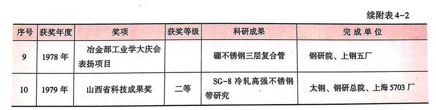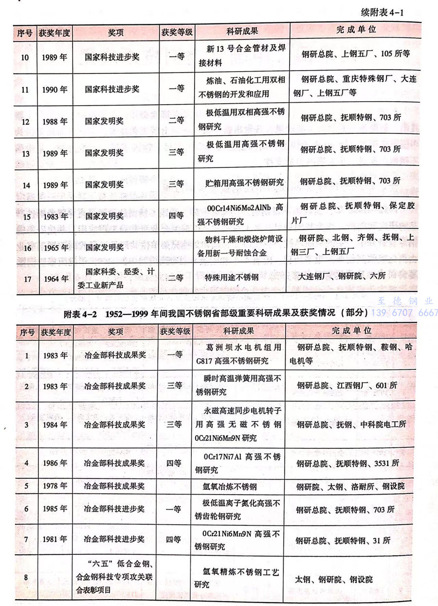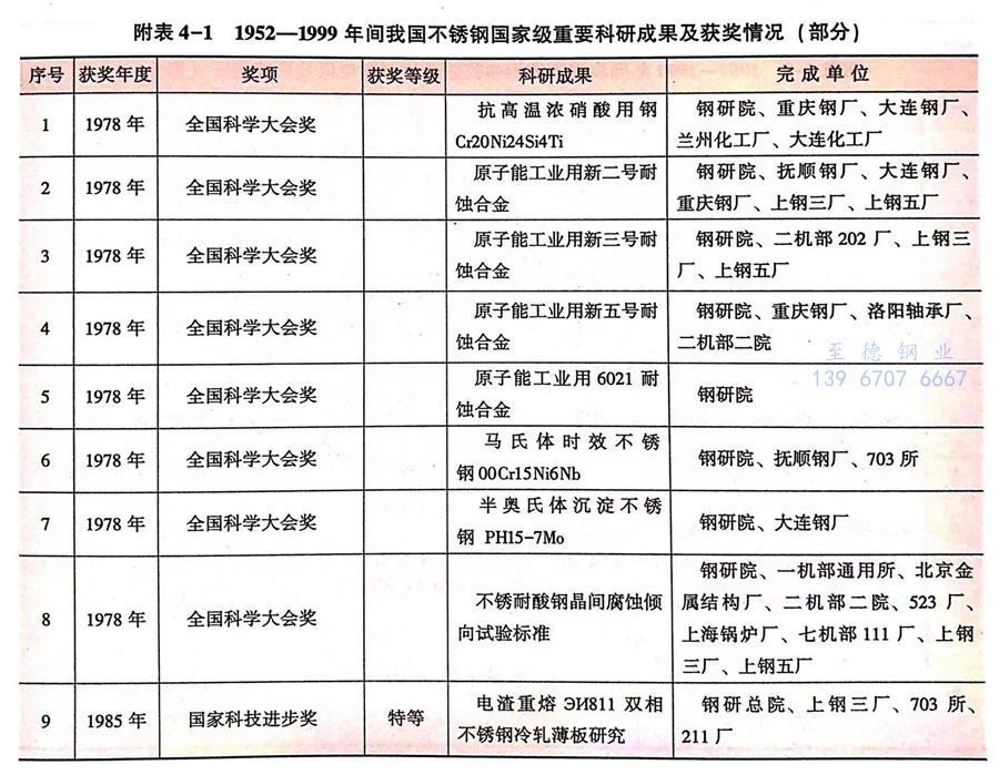 1952-1999年,是我國不銹鋼的開端與創業期。我國不銹(xiu)鋼(gang)的發展一直伴隨著鋼鐵產品的研究和創新。作為我國最早開展不銹鋼和高鎳耐蝕合金研究和工程應用,并建立不銹鋼專業研究組、室的科研單位,鋼鐵研究總院和其他兄弟單位共同見證了我國不銹鋼事業由消化吸收到創新的艱辛歷程。附表4-1和附表4-2展示了1952-1999年我國不銹鋼重要科研成果及獲獎情況(部分)。