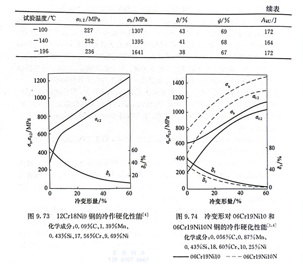 12Cr18Ni9、302不銹鋼是歷史最悠久的奧氏體不銹鋼,在固溶態具有良好的塑性、韌性和冷加工性能,但其硬化效果不如1Cr17Ni7鋼,如圖9.73所示。這是由于鎳含量的增加使奧氏體趨于穩定,冷變形時轉變為馬氏體的量趨于減少之故。該鋼固溶態及不同程度冷變形后的力學性能見表9.12及表9.34~表9.37。