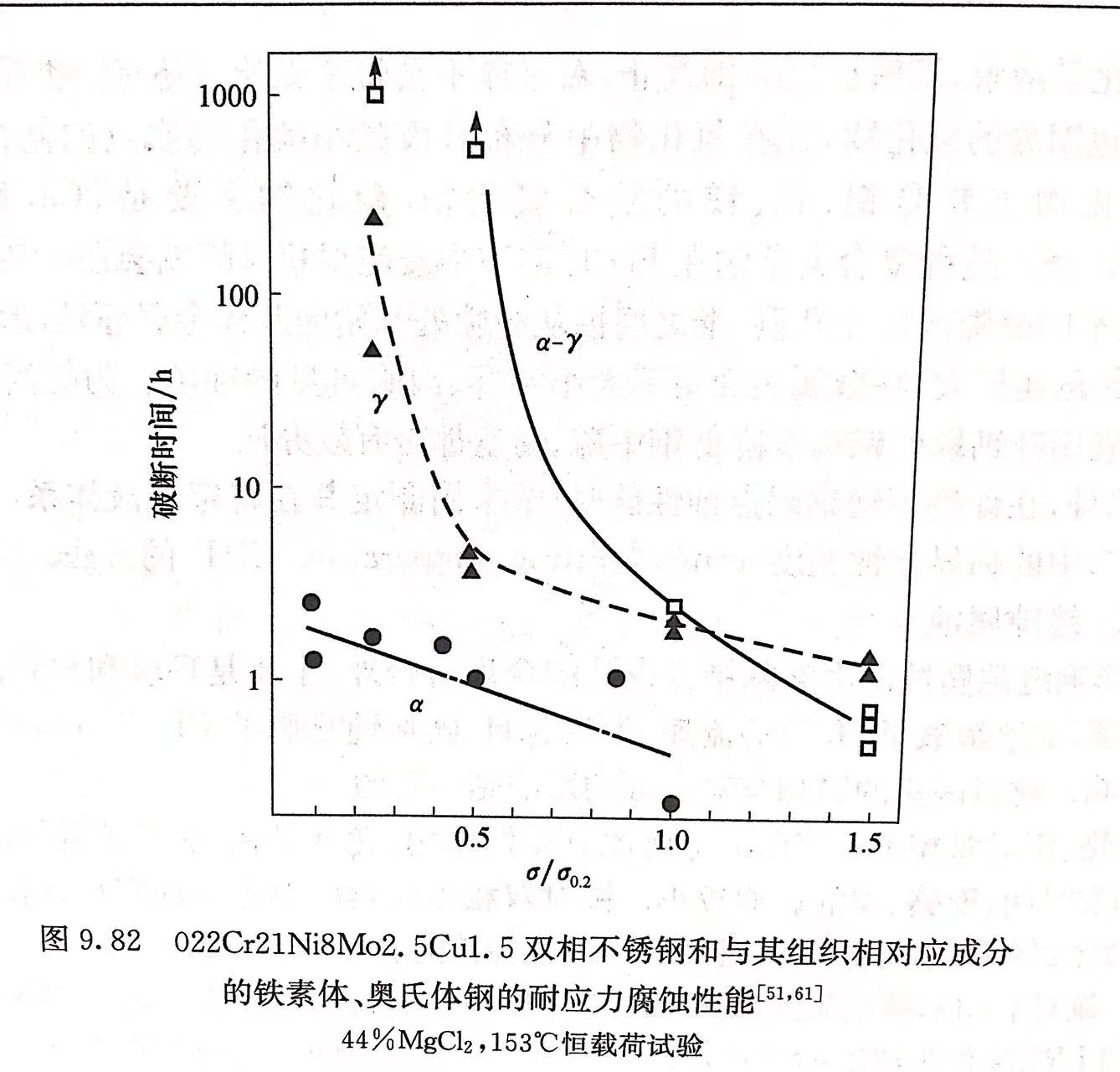 圖9.82為022Cr21Ni8Mo2.5Cu1.5(Uranus 50)雙相不銹鋼和與其組織相對應成分的鐵素體、奧氏體鋼的耐應力腐蝕性能。這三種鋼在44%MgCl2、153℃溶液中恒載荷試驗的結果表明,由于某種協同效應使雙相不銹鋼具有比鐵素體和奧氏體不銹(xiu)鋼更好的應力腐蝕抗力,同時觀察到奧氏體比鐵素體的電位高約10mV,鐵素體對奧氏體起陰極保護作用,而在高應力下鐵素體將失去這種防護作用,奧氏體因陽極溶解而出現裂紋。