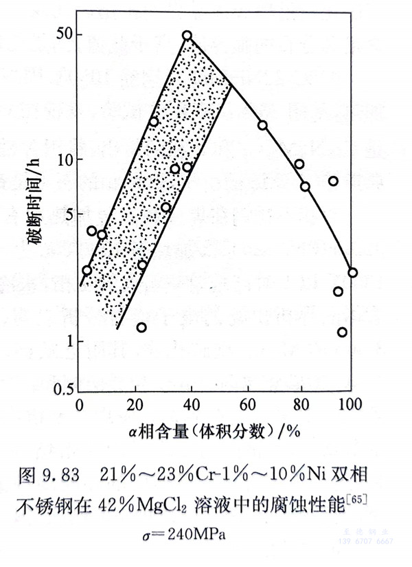 為了研(yan)究雙相不銹鋼中兩相比例的影響,采用了21%~23%Cr的基本成分,加入1%~10%Ni,以獲得不同比例的α相和γ相,在恒載荷下和42%MgCl2溶液中,進行應力腐蝕性能試驗,結果如圖9.83所示。當鋼中α相含量為40%,y相含量為60%時,鋼的耐應力腐蝕性能最佳。0在600~900℃中溫加熱,相或x相的析出將增加雙相不銹鋼對應力腐蝕的敏感性。