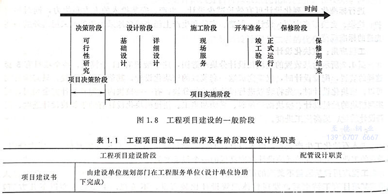 石油化工廠的(de)(de)設計是一(yi)個復雜(za)的(de)(de)系統工程,從規劃(hua)到工程設計、施工建(jian)設、裝置(zhi)的(de)(de)運行改造(zao)等各(ge)階段都會傾注(zhu)項目團隊的(de)(de)心血,它是各(ge)專業團結協作、辛(xin)勤勞動的(de)(de)結晶。工程項目建(jian)設的(de)(de)一(yi)般階段如圖1.8所示。工程項目建(jian)設一(yi)般程序及(ji)各(ge)階段配(pei)管設計的(de)(de)職責見表1.1。