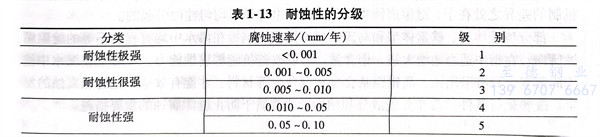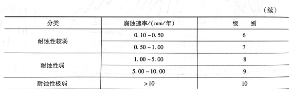 評(ping)定均勻(yun)腐蝕(shi)(shi)(shi)的(de)(de)方法是在試驗條(tiao)件下,測(ce)出單位面積(ji)上經一定時間(jian)腐蝕(shi)(shi)(shi)以后所損失(shi)的(de)(de)重量(g/㎡·年(nian)(nian)(nian)),即為(wei)(wei)(wei)(wei)腐蝕(shi)(shi)(shi)速(su)(su)率,若以被腐蝕(shi)(shi)(shi)的(de)(de)深度(mm/年(nian)(nian)(nian))計,則(ze)更便(bian)于計算設備的(de)(de)耐(nai)(nai)蝕(shi)(shi)(shi)壽命。根(gen)據(ju)腐蝕(shi)(shi)(shi)速(su)(su)率不(bu)同(tong),可將金(jin)屬材料的(de)(de)耐(nai)(nai)蝕(shi)(shi)(shi)性分為(wei)(wei)(wei)(wei)10級(ji),見表1-13。根(gen)據(ju)不(bu)同(tong)的(de)(de)使用情(qing)況對耐(nai)(nai)蝕(shi)(shi)(shi)性一般分為(wei)(wei)(wei)(wei)兩(liang)大等級(ji):腐蝕(shi)(shi)(shi)速(su)(su)率小于0.01mm/年(nian)(nian)(nian)的(de)(de),認為(wei)(wei)(wei)(wei)是“完全耐(nai)(nai)蝕(shi)(shi)(shi)”;腐蝕(shi)(shi)(shi)速(su)(su)率小于0.1mm/年(nian)(nian)(nian)的(de)(de),認為(wei)(wei)(wei)(wei)是“耐(nai)(nai)蝕(shi)(shi)(shi)”。這里顯(xian)然(ran)意味(wei)著,腐蝕(shi)(shi)(shi)速(su)(su)率超過(guo)0.1mm/年(nian)(nian)(nian),屬于不(bu)耐(nai)(nai)蝕(shi)(shi)(shi)或不(bu)太耐(nai)(nai)蝕(shi)(shi)(shi)。此外(wai),還(huan)有(you)別的(de)(de)分級(ji)方法,在此僅(jin)舉此一種(zhong)。
