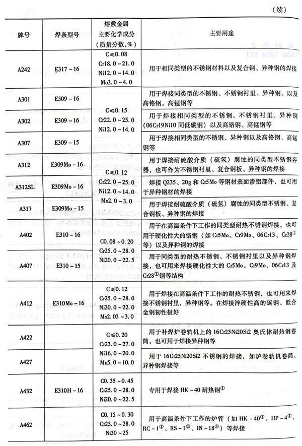 不銹(xiu)鋼焊(han)(han)條牌號及其符合或相當于(yu)國標GB/T 983-1995焊(han)(han)條型號的熔敷金屬主要化學(xue)成分及主要用途見(jian)表2-6。