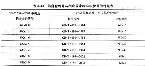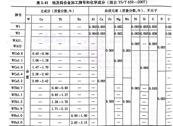 錸(lai)(lai)(Re)鎢(wu)極是在鈍鎢(wu)極基(ji)礎上加入質(zhi)(zhi)量分數為(wei)3.0%的(de)(de)(de)氧(yang)化錸(lai)(lai),并(bing)且雜質(zhi)(zhi)元素質(zhi)(zhi)量分數不大(da)于1%的(de)(de)(de)電(dian)極。錸(lai)(lai)鎢(wu)極是最近研制(zhi)(zhi)的(de)(de)(de)一(yi)種新(xin)的(de)(de)(de)電(dian)極,錸(lai)(lai)呈(cheng)銀白色,質(zhi)(zhi)硬,力(li)學性能好,電(dian)阻高。錸(lai)(lai)是用來制(zhi)(zhi)造(zao)電(dian)極、熱電(dian)偶、耐(nai)(nai)高溫和耐(nai)(nai)腐蝕的(de)(de)(de)合金(jin)的(de)(de)(de)材料。鎢(wu)及鎢(wu)合金(jin)加工牌號(hao)和化學成分見(jian)表2-41(有色金(jin)屬(shu)行業標準YS/T 659-2007)。與(yu)其(qi)相應國(guo)家標準的(de)(de)(de)對照見(jian)表2-42。