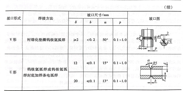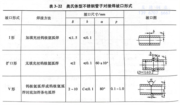 由(you)于受許用(yong)焊接電(dian)流的限制,這種焊接方法主(zhu)要(yao)用(yong)于薄板(ban)和管路的單層(ceng)焊或中厚板(ban)和管路多層(ceng)焊的封底焊道,也可(ke)用(yong)于中厚板(ban)的焊接。在保證(zheng)焊透的情(qing)況下,對(dui)接焊縫(feng)應力求(qiu)縮小(xiao)焊縫(feng)截面(mian)積,減小(xiao)熔敷金屬并(bing)考慮操作方便,故常用(yong)坡口形(xing)(xing)式有V形(xing)(xing)、U形(xing)(xing)、雙面(mian)V形(xing)(xing)及V-U組合形(xing)(xing)式等(deng)。奧氏(shi)體型(xing)不銹鋼(gang)管子對(dui)接焊坡口形(xing)(xing)式見(jian)表3-22。