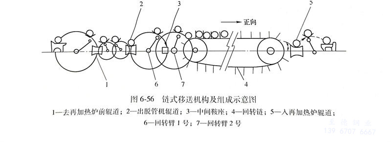 中(zhong)間冷(leng)(leng)(leng)床冷(leng)(leng)(leng)卻的(de)(de)目的(de)(de)是(shi)將出連軋(ya)機(脫(tuo)管機)的(de)(de)荒管冷(leng)(leng)(leng)卻至(zhi)Ar,溫(wen)度以(yi)下(見圖6-57),同時在冷(leng)(leng)(leng)卻的(de)(de)過程中(zhong)防(fang)止鋼(gang)管彎(wan)曲(qu),中(zhong)間冷(leng)(leng)(leng)床采用(yong)雙向鏈(lian)式移送機構如圖6-56所示,正向鏈(lian)的(de)(de)作用(yong)是(shi)以(yi)一(yi)(yi)定的(de)(de)間隔(ge)時間帶動(dong)鋼(gang)管向冷(leng)(leng)(leng)床另一(yi)(yi)端旋轉前進直至(zhi)將不銹鋼(gang)管冷(leng)(leng)(leng)卻至(zhi)Ar,溫(wen)度以(yi)下,然(ran)后撥入(ru)再(zai)加熱爐的(de)(de)入(ru)爐輥(gun)道被送入(ru)再(zai)加熱爐(圖6-58),反(fan)向鏈(lian)的(de)(de)作用(yong)是(shi)帶動(dong)荒管以(yi)一(yi)(yi)定的(de)(de)速(su)度旋轉,防(fang)止荒管彎(wan)曲(qu)。鏈(lian)式冷(leng)(leng)(leng)床與(yu)步進式冷(leng)(leng)(leng)床相比節奏調整范圍(wei)更寬,操作靈(ling)活,不僅可用(yong)在在線常化工藝(yi)的(de)(de)控制冷(leng)(leng)(leng)卻上,也可以(yi)用(yong)在其他熱處(chu)理工藝(yi)的(de)(de)控制冷(leng)(leng)(leng)卻上。