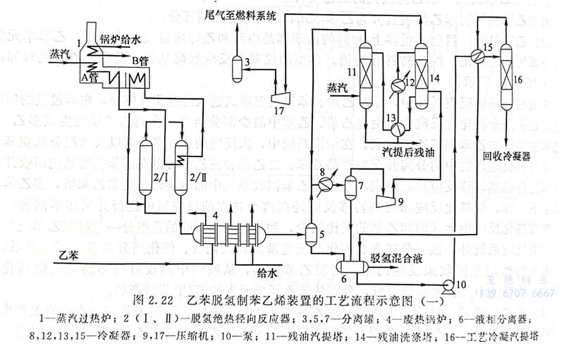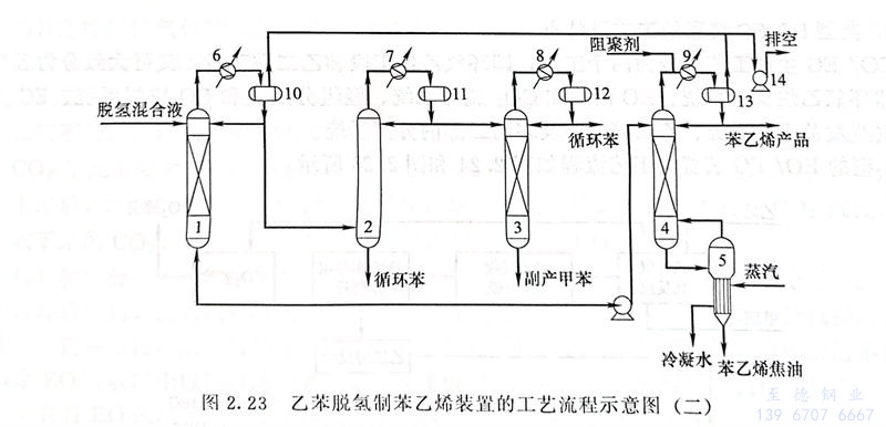 目前,由乙苯制苯乙烯多采用脫氫方法。脫氫工藝制苯乙烯的工藝由兩個可以獨立運轉的系統組成,分別是脫氫反應系統和精餾系統。典型乙苯脫氧制苯乙烯裝置的工藝流程如圖2.22和(he)圖2.23所(suo)示。
