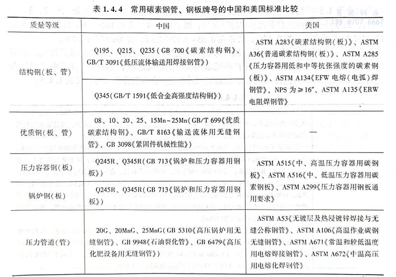 常用碳(tan)素鋼管(guan)、鋼板牌號的中國和美國標準比較見表(biao)1.4.4。