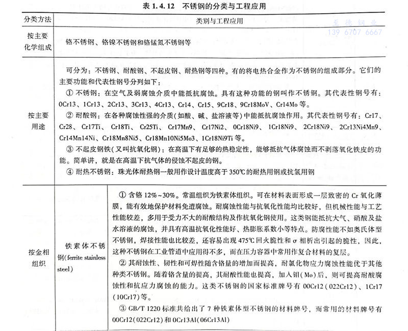 不銹鋼是一種以鐵和碳為基礎的含有較多合金元素的高合金鋼,具有不易生銹的特點,但是,不是絕對的不生銹,而是生銹量、被腐蝕量少,生銹和被腐蝕的過程較慢,甚至根本不能察覺。不銹鋼(gang)(gang)鋼(gang)(gang)號(hao)中碳含量以千分之幾表示。例如“1Cr13”鋼的平均碳含量為0.1%;若鋼中含碳量≤0.03%或≤0.08%者,鋼號前分別冠以“00”及“0”表示之,例如0Cr18Ni9(06Cr19Ni10)為不銹(xiu)鋼(gang)牌號,牌號表示鋼材中的主要合金元素的百分含量,C≤0.08%,Cr=17.00%~19.%~19.00%,Ni=8.00%~11.00%。不銹鋼的分類與工程應用見表1.4.12。