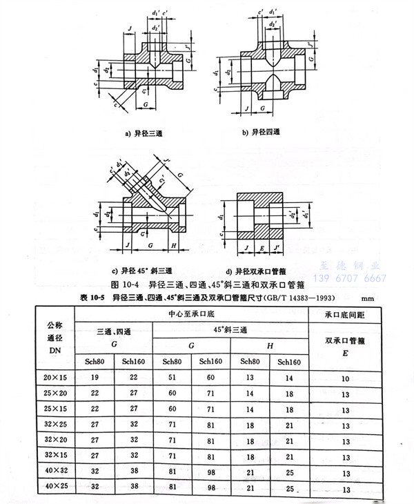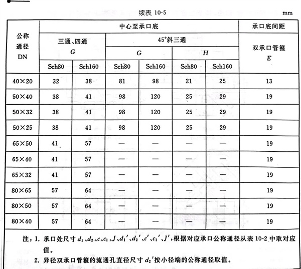 45°彎頭和90噸彎頭、三通(tong)和四通(tong)型式見圖 10-2 ,尺寸(cun)見表 10-3。