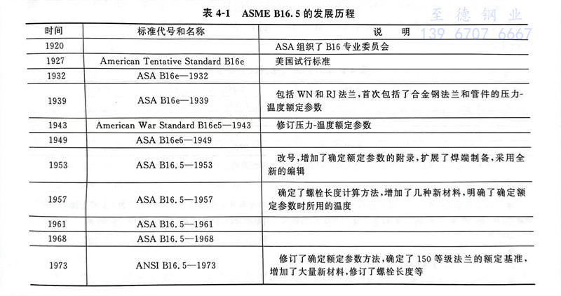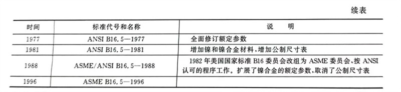 美國ASMEB16.5《管法蘭和法蘭管件》是一套在世界上通用的、系統性較強、內容涉及墊片、螺栓及管子的完整的管(guan)法蘭(lan)標準(表4-1)。其公稱直徑為NPS1/2~24,其適用的不銹鋼(gang)管(guan)外徑尺寸應符合 ASME B36.10M。該標準從1927年經美國標準協會(ASA)批準為美國試行標準B16e以來,已經先后進行了十多次修訂。1981年增加了公制尺寸,稱為ANSIB16.5,但在1988年版中取消了公制尺寸,稱為ASME/ANSI B16.5,1996年開始稱為ASME B16.5,一直沿用到現在的最新版本。