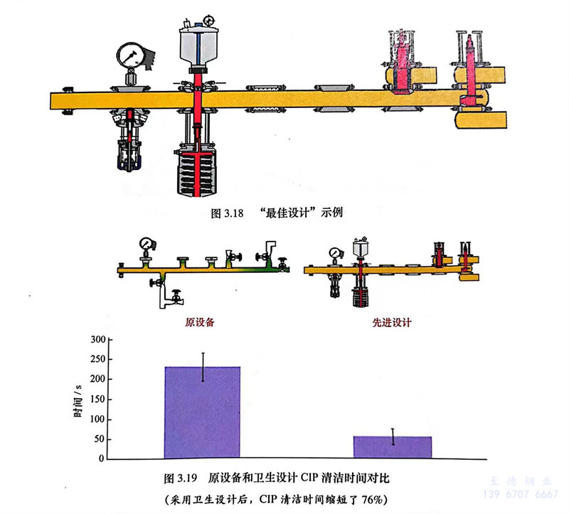 然后,他將原設(she)備設(she)計與“最佳設(she)計”進行了(le)比較(jiao)。最佳設(she)計采(cai)用(yong)了(le)衛生設(she)計的(de)原則(ze)采(cai)用(yong)無(wu)縫隙接頭,采(cai)用(yong)平(ping)滑的(de)彎管(guan),最大程度(du)減(jian)少死角等(圖(tu)3.18)。最先進的(de)設(she)計可(ke)以(yi)提高清潔(jie)效(xiao)率。