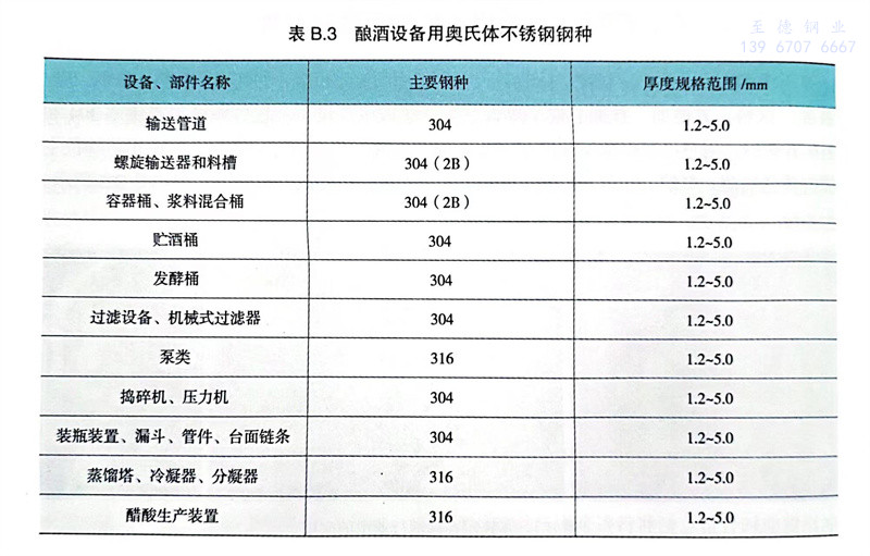 葡萄酒等生(sheng)產(chan)(chan)設(she)備也大量(liang)使(shi)用(yong)304和316不銹(xiu)鋼,其(qi)中304不銹(xiu)鋼主(zhu)要(yao)用(yong)于容器桶、料(liao)槽、貯酒桶、發(fa)酵桶、過濾(lv)設(she)備、搗碎機(ji)、壓力(li)機(ji)、管件等;316不銹(xiu)鋼主(zhu)要(yao)用(yong)于蒸餾塔、冷凝(ning)器、分凝(ning)器、酒醋(cu)生(sheng)產(chan)(chan)裝置,釀酒設(she)備或配件用(yong)不銹(xiu)鋼鋼種、主(zhu)要(yao)產(chan)(chan)品(pin)與生(sheng)產(chan)(chan)企業如(ru)表B.3~表B.5所示(shi)。