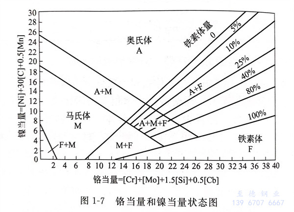 圖1-7為(wei)鉻(ge)當(dang)量(liang)和鎳當(dang)量(liang)狀(zhuang)態圖,該圖適用于Cr-Ni鋼系統,可(ke)以根據鋼的(de)化學成分換算成鉻(ge)當(dang)量(liang)和鎳當(dang)量(liang),來估計鋼的(de)組(zu)織狀(zhuang)態。