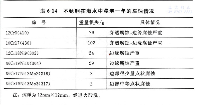 不銹鋼在(zai)海水(shui)中浸泡一年的(de)腐(fu)蝕情況,見表6-14。