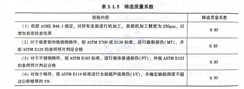 相對于軋制或鍛制的不銹鋼管道元件,鑄件缺陷相對較多,機械性能有所下降。在ASME B31.3中,為了衡量鑄件機械性能下降的程度,用鑄造質量系數來表示。鑄造質量系數同樣與無損探傷的檢驗數量有關。一般情況下,符合材料基本要求且根據MSS SP-55的規定已經過肉眼檢驗的靜態鑄件,可取其基本鑄造質量系數為0.8,對每一鑄件進行補充檢驗后可以按表3.1.5的要求提高。鑄件用作壓力管道及其元件的情況并不多,DN≥50閥門的閥體常采用鑄件,閥門閥體的強度設計一般由制造商進行,多數閥門標準已經給出了最小壁厚要求,實際管道設計中很少用到鑄造質量系數這個概念。ASME B31.3規定,用于劇烈操作條件下及工藝介質管道上的焊接和鑄造不銹(xiu)鋼管件,其焊接質量系數和鑄造質量系數均不得低于0.9。在國內外管道設計標準規范中,有鑄造質量系數的規定。例如,GB 50316規定:如對鑄件進行補充檢測,質量系數可提高至表內規定的數值,但在任何情況下,質量系數不應超過1.00。