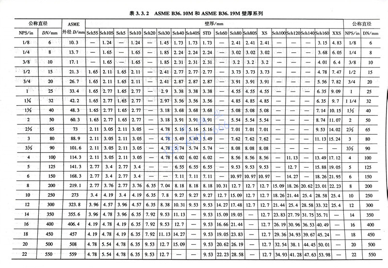 ASME B36.10M《焊接和無縫軋制鋼管》和ASME B36.19M《不銹(xiu)鋼(gang)管(guan)道》壁厚系列見表3.3.2。