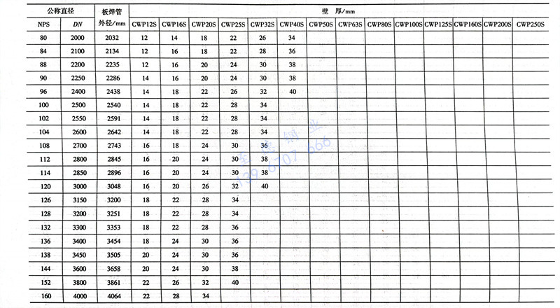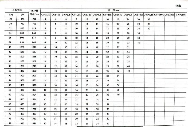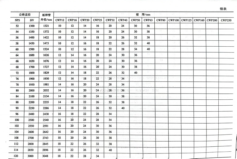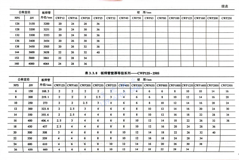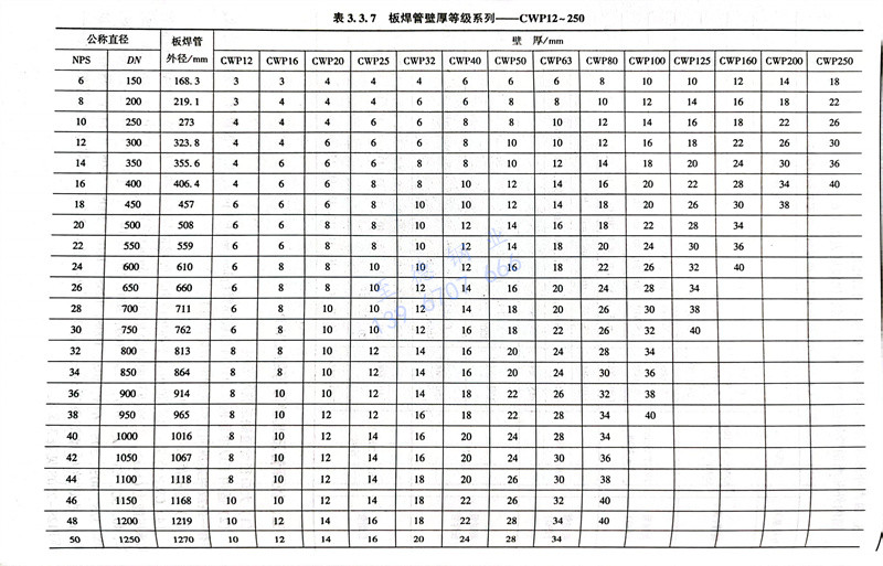 (4)CWP含(han)義(yi):①. 數值相當(dang)于許用應力與焊接質量系(xi)數的乘積,等于125MPa時鋼管(guan)的承壓能(neng)力(bar)。②. 按兩(liang)種(zhong)腐(fu)蝕余量(0,1.5mm)設置。③. 其中(zhong)(zhong)CWP 12、16、20、25、32、40、50、63、80、100、125、160、200、250共14個。④. 其中(zhong)(zhong)CWP 12S、16S、20S、25S、32S、40S、50S、63S、80S、100S、125S、160S、200S、250S共14個。⑤. 最大厚度40mm。板焊管(guan)壁厚等級系(xi)列-CWP12~250見表3.3.7,板焊管(guan)壁厚等級系(xi)列CWP12S~250S見表3.3.8。