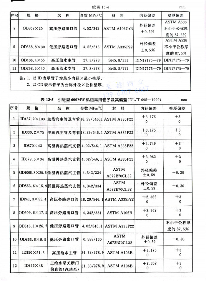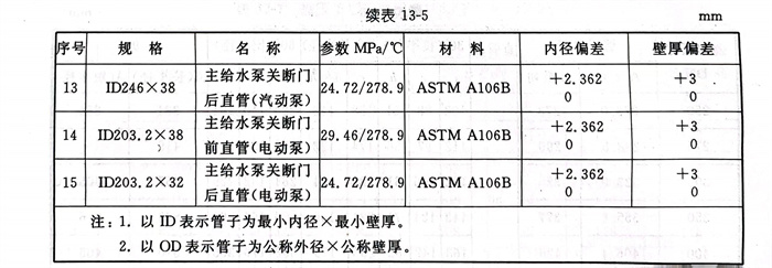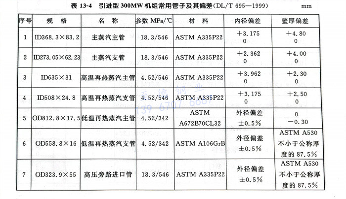 引(yin)進型(xing)300MW機組(zu)常用管子(zi)及其偏(pian)差見表(biao)13-4,引(yin)進型(xing)600MW 機組(zu)常用管子(zi)及其偏(pian)差見表(biao)13-5。
