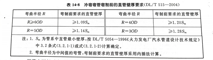 d. 用作不銹鋼(gang)彎管的直管,其最小壁厚的選擇見表14-7及表14-8。彎制時應將直管較厚的一側置于彎管的受拉側。