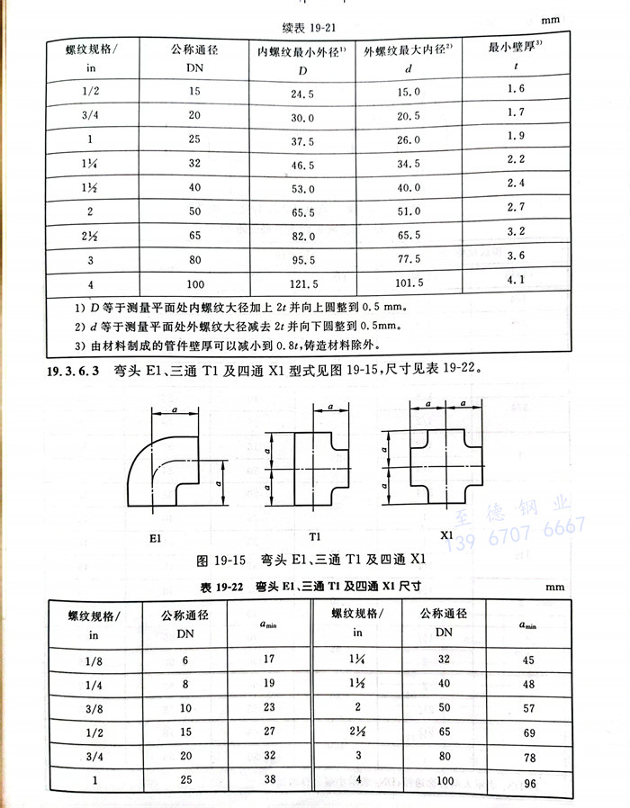 彎(wan)頭 E1、三(san)通(tong) T1 及四通(tong) X1 型式見圖19-15,尺寸見表19-22。