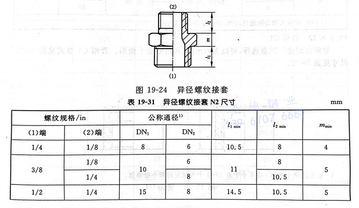 六(liu)角(jiao)頭螺紋接套可以(yi)有六(liu)角(jiao)形(xing)(xing)(xing)(xing)(xing)、八角(jiao)形(xing)(xing)(xing)(xing)(xing)、十角(jiao)形(xing)(xing)(xing)(xing)(xing)等種類。規格(ge)在1/2以(yi)下的(de)只有六(liu)角(jiao)形(xing)(xing)(xing)(xing)(xing)1種;規格(ge)為3/4~2的(de)有六(liu)角(jiao)形(xing)(xing)(xing)(xing)(xing)或(huo)八角(jiao)形(xing)(xing)(xing)(xing)(xing)2種;規格(ge)為2/2~4的(de)有六(liu)角(jiao)形(xing)(xing)(xing)(xing)(xing)、八角(jiao)形(xing)(xing)(xing)(xing)(xing)或(huo)十角(jiao)形(xing)(xing)(xing)(xing)(xing)3種,六(liu)角(jiao)形(xing)(xing)(xing)(xing)(xing)螺紋接套型式 N1 見(jian)圖19-23,尺寸見(jian)表19-30。