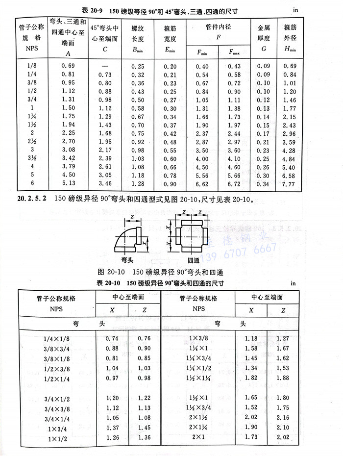 150磅級等徑90°和45°彎頭、三通和四通型式見圖20-9,尺寸見表20-9。
