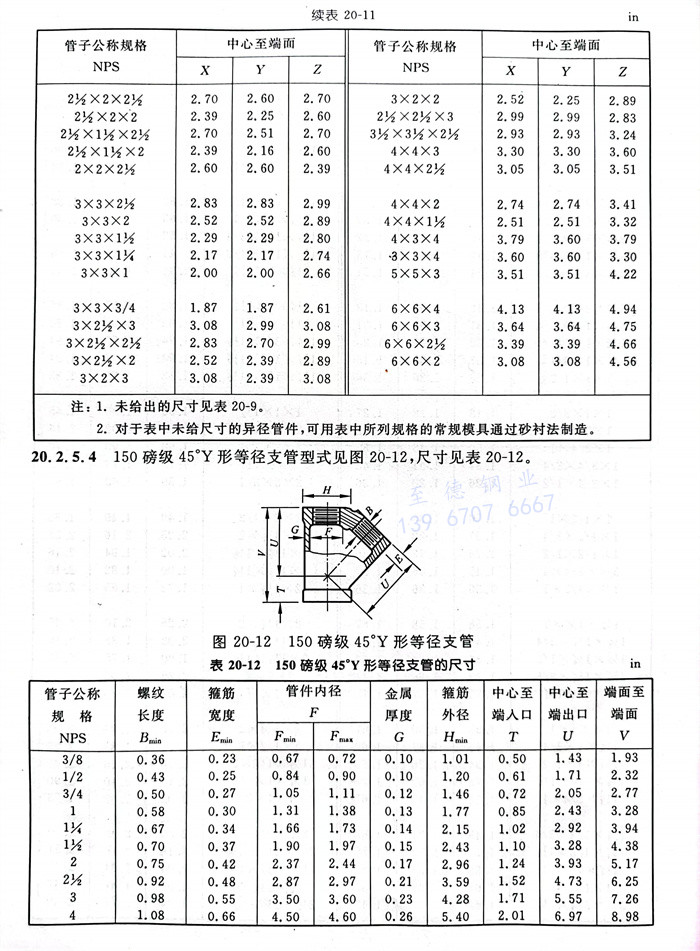 150磅級45°Y形等徑(jing)支管型式見圖(tu)20-12,尺寸見表(biao)20-12。