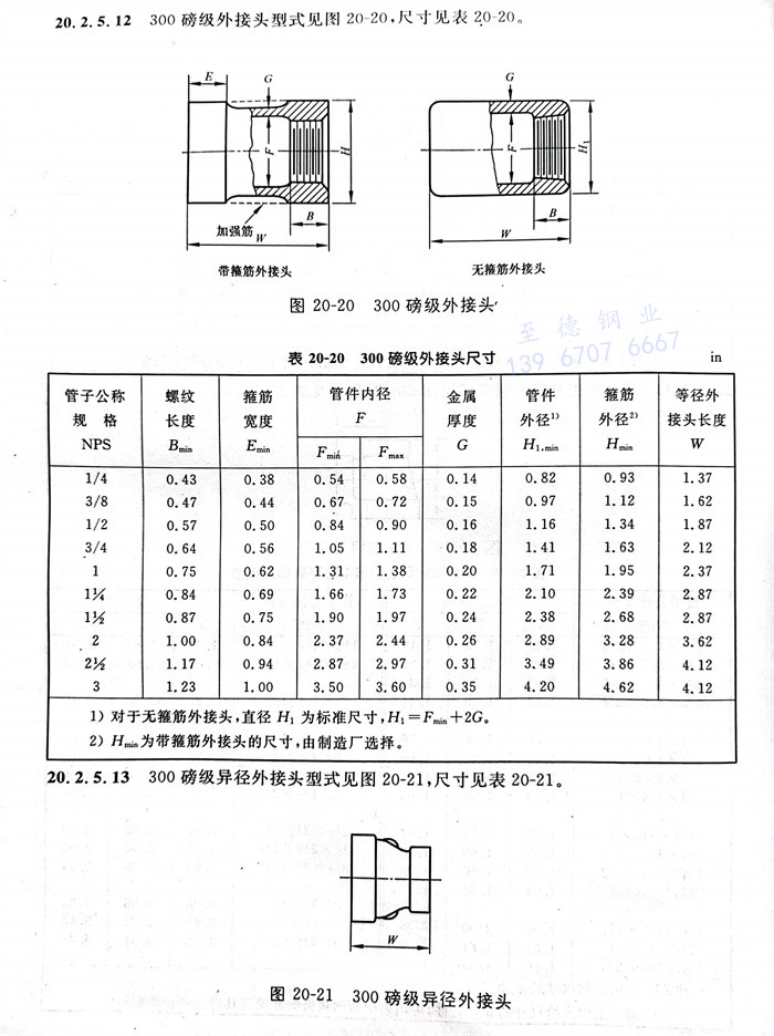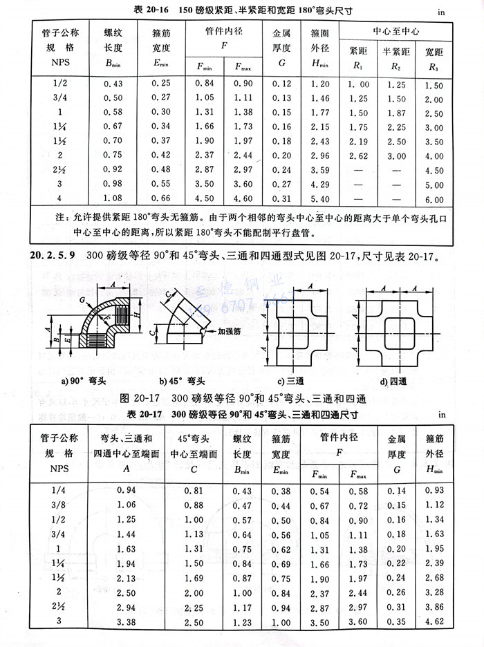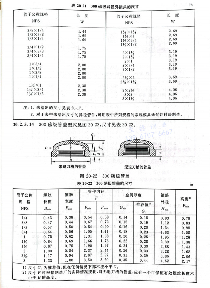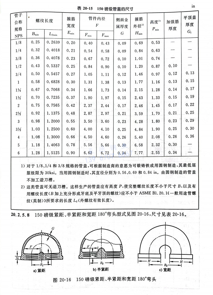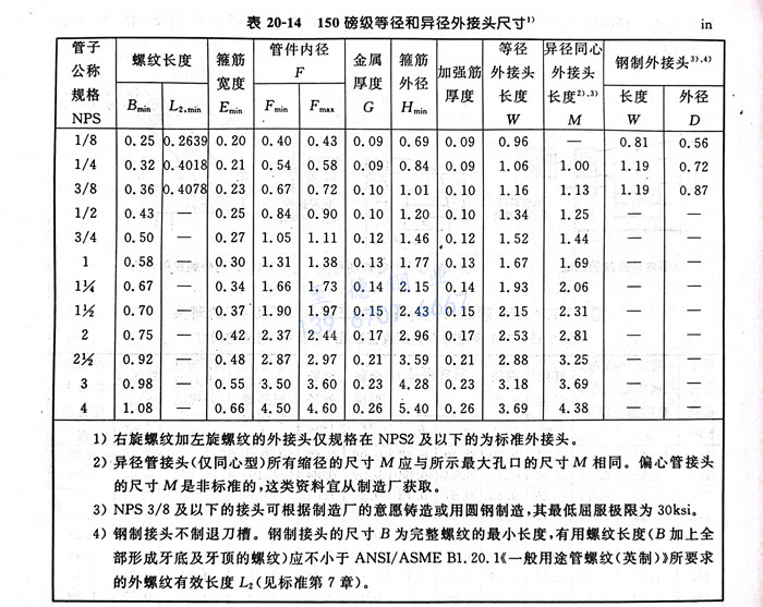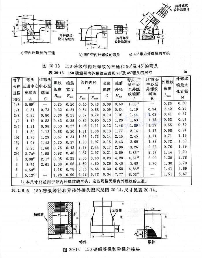 所有(you)管(guan)件均應(ying)按ASME B1.20.1《一般用途的英制管(guan)螺(luo)(luo)紋》加工(gong)螺(luo)(luo)紋,除NPS 1/8、NPS 1/4和(he)NPS 3/8規(gui)格的鍛軋接(jie)頭(表20-14)和(he)管(guan)蓋(表20-15)可(ke)用圓柱管(guan)螺(luo)(luo)紋外,其他所有(you)管(guan)件均應(ying)為錐管(guan)螺(luo)(luo)紋。