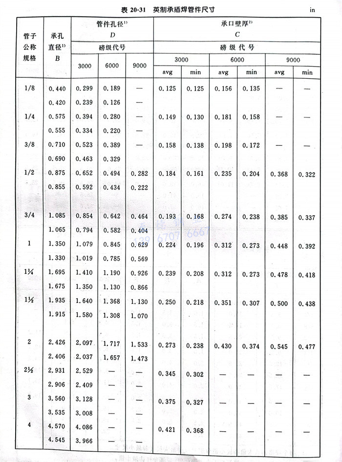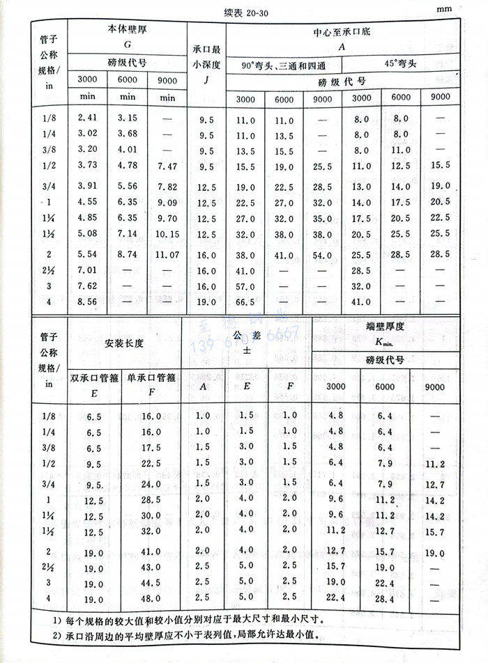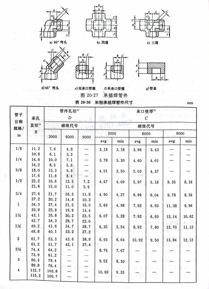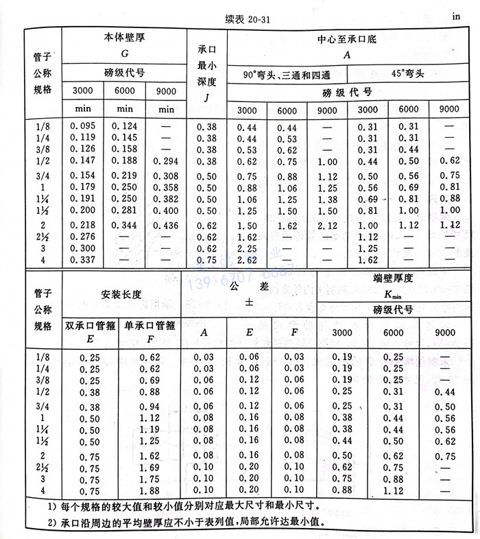 承插焊(han)管(guan)件本體壁厚(hou)應等于(yu)或大于(yu)表20-30和20-31中所(suo)示(shi)的G值。