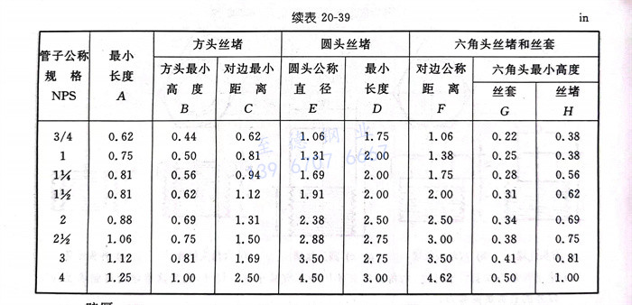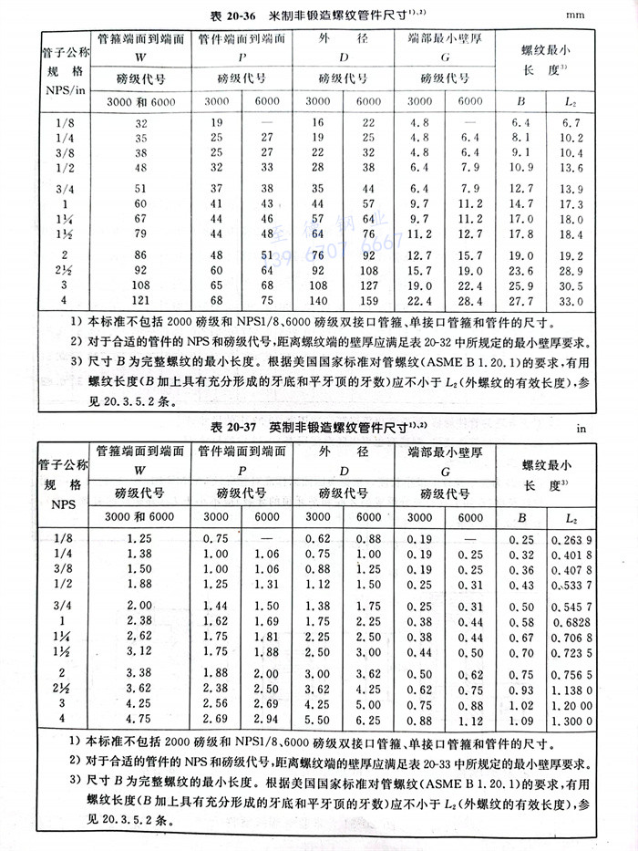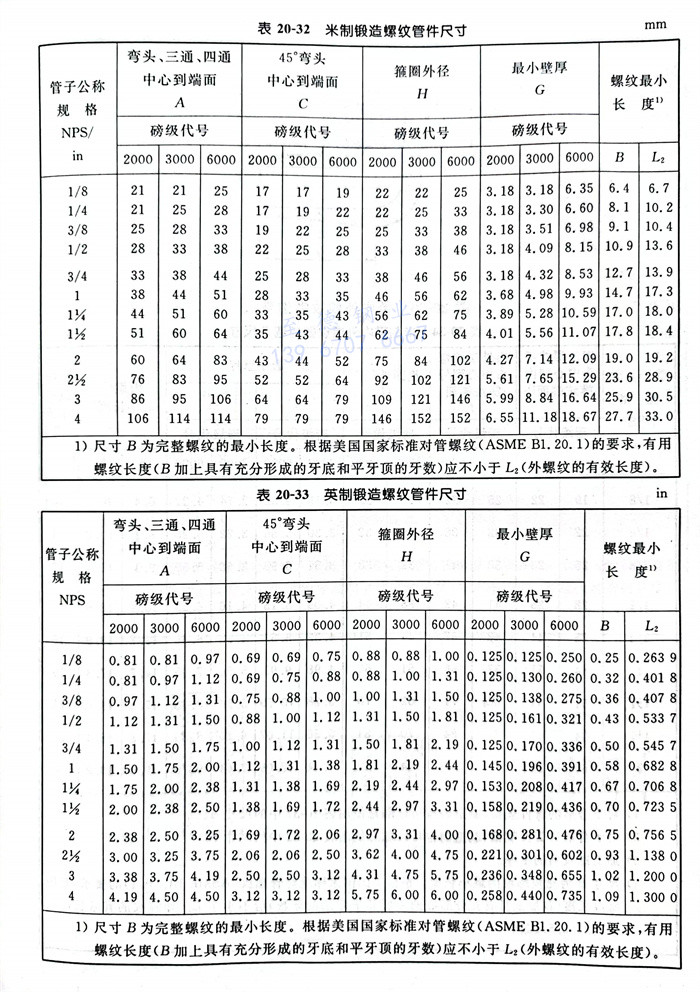 由于ASME B36.10M既不(bu)包(bao)括(kuo)Sch160,也不(bu)包(bao)括(kuo)NPS1/8、NPS1/4和NPS3/8雙倍加(jia)厚管(guan)的壁(bi)厚,所以表20-28中的數值可用于作為確定等級時管(guan)子的公稱壁(bi)厚。