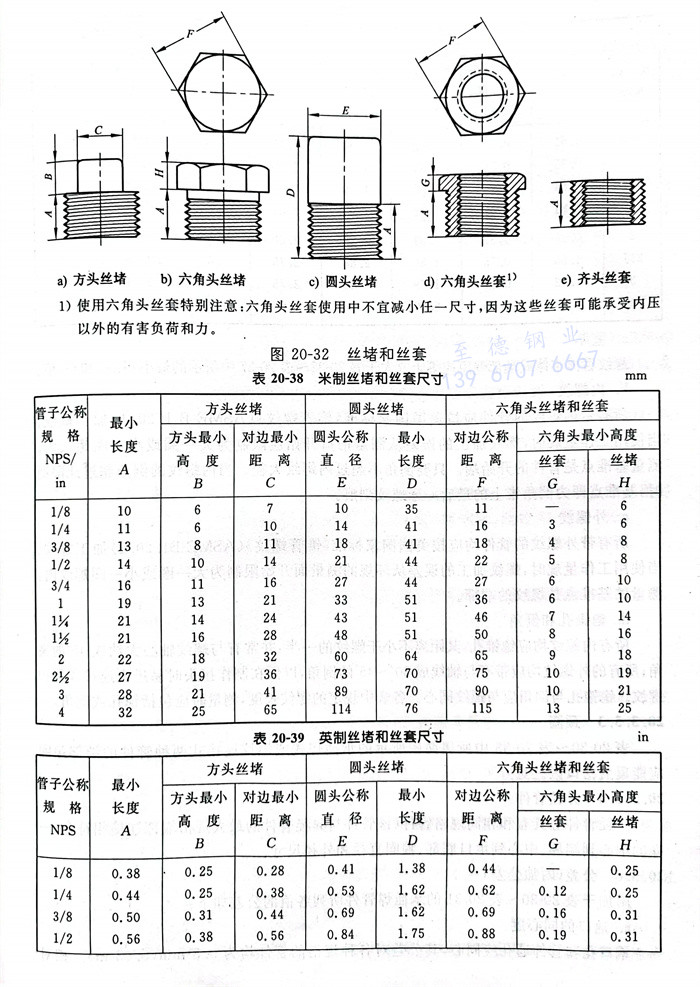 米制絲(si)堵和絲(si)套(tao)的(de)型式見圖(tu)20-32,尺寸見表(biao)20-38;英制絲(si)堵和絲(si)套(tao)的(de)型式見圖(tu)20-32,尺寸見表(biao)20-39。