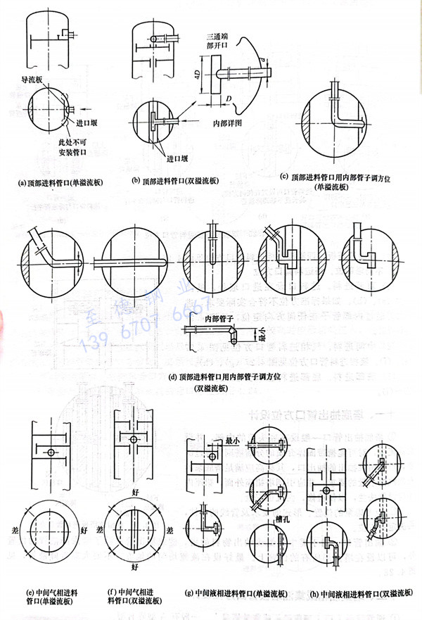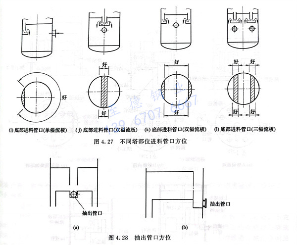b. 中(zhong)間進料(liao)。氣相進料(liao)管口(kou)方位(wei)見(jian)圖4.27(e)、(f)。液相進料(liao)管口(kou)方位(wei)見(jian)圖4.27(g)、(h)。