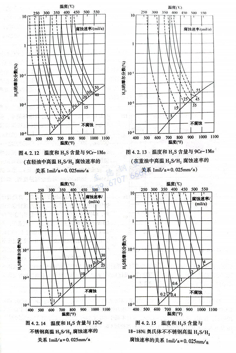 (9)對操作溫度等于或高于250℃、介質為H2S+H2的材料,應根據高溫H2S+H2對各鋼種的腐蝕率按圖4.2.8~圖4.2.15選用(最新版“柯柏曲線”,SH/T3129《加工高硫原油重點裝置主要管道設計選材導則》和SY/T 0599《天然氣地面設施抗硫化物應力開裂和抗應力腐蝕開裂的金屬材料要求》均有此規定)。
