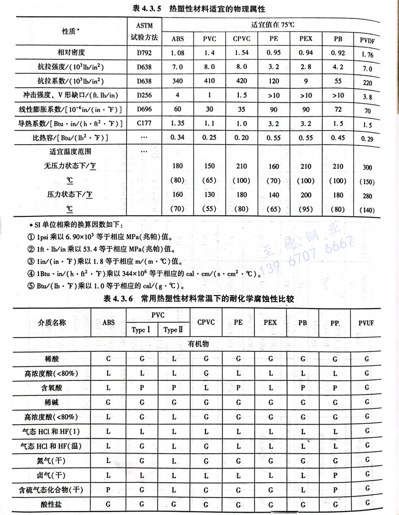 熱塑(su)性(xing)材(cai)料(liao)適宜的物(wu)理屬性(xing)見表(biao) 4.3.5 ,常(chang)用熱塑(su)性(xing)材(cai)料(liao)常(chang)溫下的耐化學性(xing)腐蝕比較 見表(biao) 4.3.6
