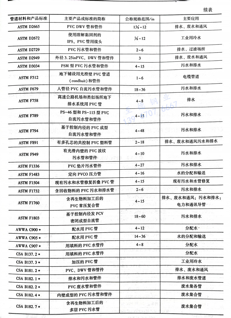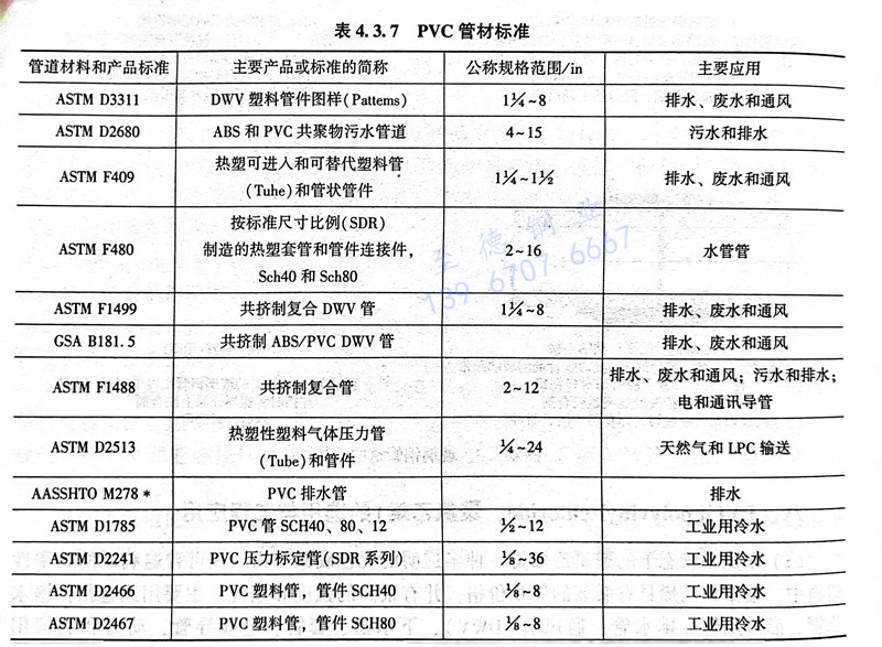 (4)PVC管(guan)材規格已經(jing)標(biao)準化(hua)(hua),如表4.3.7所示。PVC管(guan)適用(yong)(yong)溫(wen)(wen)(wen)度(du)范圍為-15~60℃,下限溫(wen)(wen)(wen)度(du)使(shi)用(yong)(yong)時(shi)容易開裂,高于上限溫(wen)(wen)(wen)度(du)使(shi)用(yong)(yong)時(shi)軟(ruan)化(hua)(hua)。PVC管(guan)一般分為輕型管(guan)和(he)重型管(guan)兩種。硬聚氯乙烯管(guan)可用(yong)(yong)于真空度(du)<740mmHg的(de)管(guan)道。常(chang)溫(wen)(wen)(wen)下,硬聚氯乙烯管(guan)的(de)使(shi)用(yong)(yong)壓力如下:輕型管(guan)≤0.6MPa;重型管(guan)≤1.0MPa。