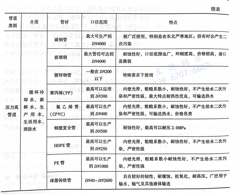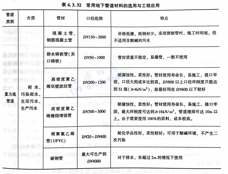 除生活(huo)給(gei)水管(guan)(guan)(guan)(guan)室內(nei)部(bu)分采(cai)用(yong)塑(su)料(liao)(liao)管(guan)(guan)(guan)(guan)外,其(qi)余給(gei)水管(guan)(guan)(guan)(guan)道(dao)(dao)(dao)一般鋼(gang)管(guan)(guan)(guan)(guan),焊(han)(han)接(jie)(jie)(jie)連(lian)(lian)接(jie)(jie)(jie)。含(han)油污水、生產污水管(guan)(guan)(guan)(guan)道(dao)(dao)(dao)建議采(cai)用(yong)輸送流體(ti)用(yong)無縫鋼(gang)管(guan)(guan)(guan)(guan),焊(han)(han)接(jie)(jie)(jie)連(lian)(lian)接(jie)(jie)(jie),也有(you)的(de)(de)采(cai)用(yong)低壓(ya)流體(ti)輸送用(yong)焊(han)(han)接(jie)(jie)(jie)鋼(gang)管(guan)(guan)(guan)(guan)。雨水管(guan)(guan)(guan)(guan)道(dao)(dao)(dao)一般采(cai)用(yong)球(qiu)磨(mo)鑄(zhu)(zhu)鐵管(guan)(guan)(guan)(guan),承插連(lian)(lian)接(jie)(jie)(jie)。球(qiu)墨(mo)鑄(zhu)(zhu)鐵管(guan)(guan)(guan)(guan)耐腐蝕性能(neng)較強、管(guan)(guan)(guan)(guan)壁(bi)較厚(hou)、對管(guan)(guan)(guan)(guan)道(dao)(dao)(dao)基礎的(de)(de)要(yao)求較低、施工費(fei)用(yong)低。生活(huo)污水管(guan)(guan)(guan)(guan)道(dao)(dao)(dao)室內(nei)部(bu)分一般采(cai)用(yong)建筑排(pai)水用(yong)PVC-U管(guan)(guan)(guan)(guan)道(dao)(dao)(dao),粘接(jie)(jie)(jie)連(lian)(lian)接(jie)(jie)(jie);室外部(bu)分一般采(cai)用(yong)低壓(ya)流體(ti)輸送用(yong)焊(han)(han)接(jie)(jie)(jie)鋼(gang)管(guan)(guan)(guan)(guan),焊(han)(han)接(jie)(jie)(jie)連(lian)(lian)接(jie)(jie)(jie),以避免過路時(shi)生活(huo)污水管(guan)(guan)(guan)(guan)道(dao)(dao)(dao)被壓(ya)損。鋼(gang)骨架增(zeng)強塑(su)料(liao)(liao)復(fu)合管(guan)(guan)(guan)(guan)作(zuo)為新型管(guan)(guan)(guan)(guan)材,具有(you)機械強度高、耐溫性能(neng)好、雙面防腐、節能(neng)等優點,適用(yong)于絕大部(bu)分石油化工給(gei)埋地(di)排(pai)水管(guan)(guan)(guan)(guan)道(dao)(dao)(dao)。常用(yong)地(di)下管(guan)(guan)(guan)(guan)道(dao)(dao)(dao)材料(liao)(liao)的(de)(de)選用(yong)見表4.3.32。