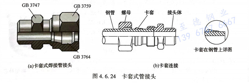 卡(ka)(ka)套式管(guan)接頭一(yi)般(ban)主要由接頭體、卡(ka)(ka)套、螺(luo)母三部分組(zu)成(cheng)(cheng)。當卡(ka)(ka)套和(he)螺(luo)母套在(zai)鋼(gang)管(guan)上插(cha)入接頭體后,旋緊螺(luo)母時,卡(ka)(ka)套前端外側(ce)與(yu)接頭體錐面貼合(he),內(nei)刃均勻地咬入無縫鋼(gang)管(guan),形成(cheng)(cheng)有效密封,見(jian)圖(tu)4.6.21。卡(ka)(ka)套接頭的工作原(yuan)理是將鋼(gang)管(guan)插(cha)入卡(ka)(ka)套內(nei),利(li)用(yong)卡(ka)(ka)套螺(luo)母鎖緊,抵觸卡(ka)(ka)套,切(qie)入管(guan)子而密封。它(ta)與(yu)鋼(gang)管(guan)連接時不(bu)需焊接,有利(li)于(yu)防火、防爆(bao)和(he)高(gao)空作業,并能消除焊接不(bu)慎(shen)帶來(lai)的弊端,是煉油(you)、化(hua)工、石(shi)油(you)、天然氣、食品、制(zhi)藥、儀器儀表等系統自(zi)控(kong)裝置(zhi)(zhi)管(guan)路中的一(yi)種較為先進的連接件(jian),適用(yong)于(yu)油(you)、氣、水等介質(zhi)管(guan)路連接。在(zai)石(shi)化(hua)裝置(zhi)(zhi)內(nei)一(yi)般(ban)用(yong)于(yu)外徑小(xiao)于(yu)等于(yu)25mm管(guan)子,適用(yong)于(yu)蒸汽伴(ban)管(guan)、檢漏管(guan)和(he)儀表控(kong)制(zhi)系統。