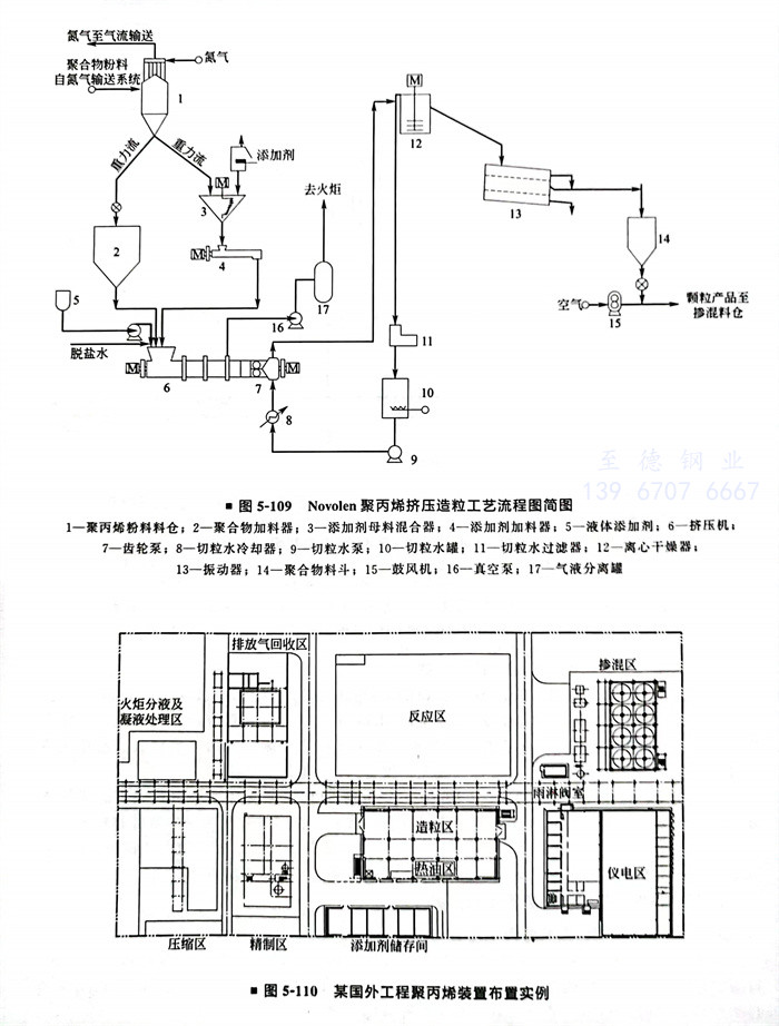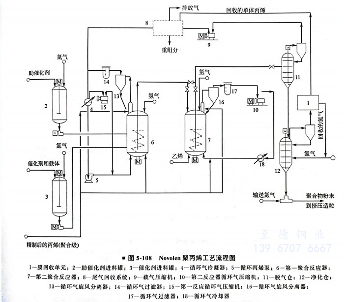 Novolen 包括原料精制(zhi)、催化劑配(pei)制(zhi)、聚合反應、聚合物粉料的凈(jing)化、擠壓造粒等工序,如圖5-108和圖5-109所示(shi)。