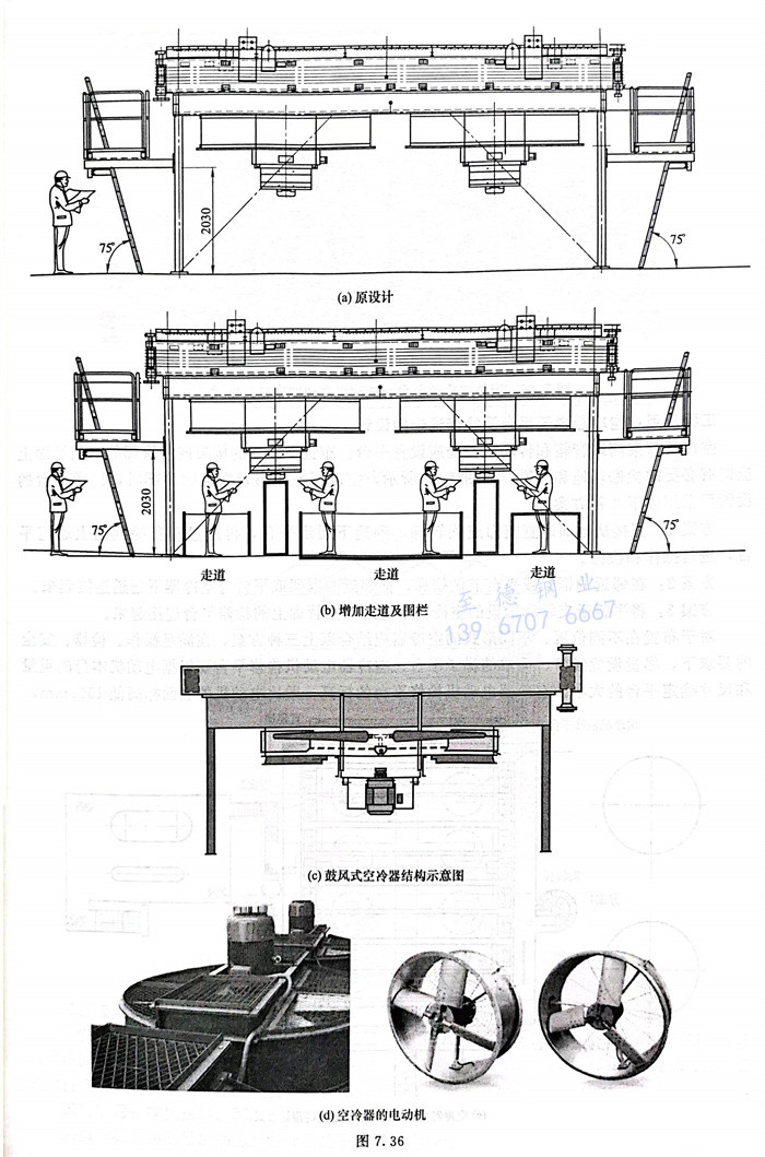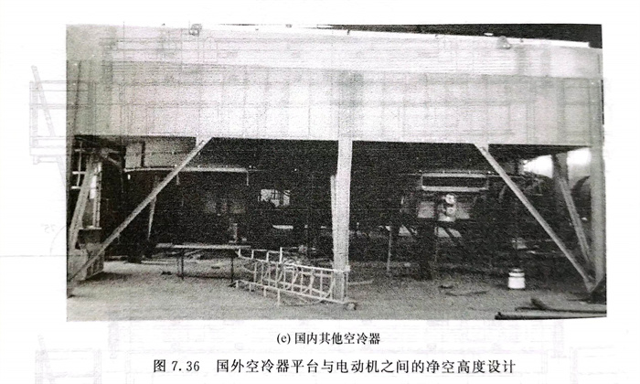 浙(zhe)江至德鋼(gang)業(ye)有限公司在(zai)進行(xing)某空(kong)冷器(qi)設(she)計評審(shen)時,業(ye)主按照他們國家的(de)規范(fan)要(yao)求:空(kong)冷器(qi)下方“walking/working surfaces(行(xing)走/工作面)”區域(yu)凈(jing)空(kong)高(gao)(gao)度(du)至少(shao)為2030mm。而設(she)計的(de)實際空(kong)冷器(qi)高(gao)(gao)度(du),如圖(tu)(tu)7.36(a)所示(shi),電動機下方沒有滿足這(zhe)個高(gao)(gao)度(du)要(yao)求,如果(guo)修改空(kong)冷器(qi)支(zhi)腿高(gao)(gao)度(du),則對項目影響(xiang)很大。后來,在(zai)空(kong)冷器(qi)下增加了走道和欄桿(gan),如圖(tu)(tu)7.36(b)所示(shi),滿足了當地的(de)規范(fan)要(yao)求。圖(tu)(tu)7.36(c)~(e)為有關設(she)計參考圖(tu)(tu)。